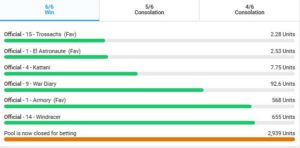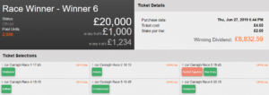 The player had done it, a phenomenal six wins from six with some very tricky races to navigate and just two favourites landing. 99.9% of the initial units had fallen by the wayside and just two remained. As such the player landed a staggering £8,832 winning dividend for their efforts. Well done on an incredible win!