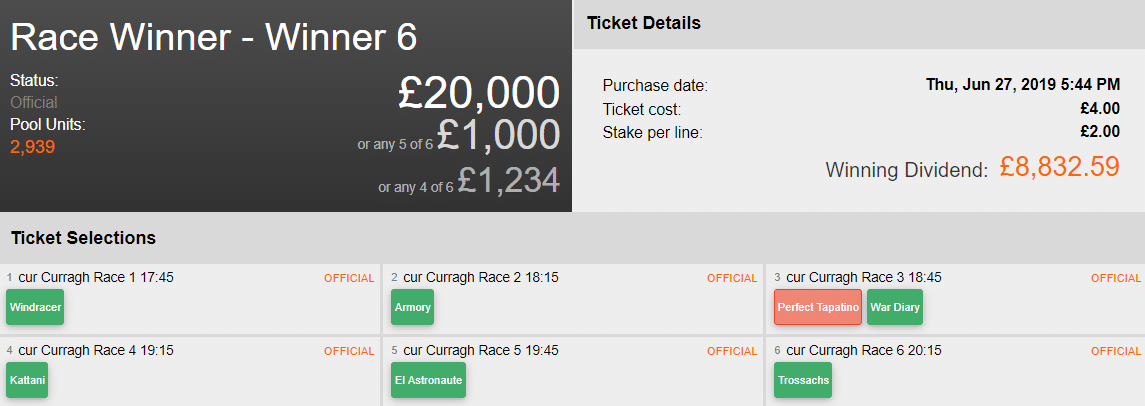 A Colossus player enjoyed an incredible evening at the Curragh on Thursday, sensationally turning a £4 stake into £8,832.59 in the Win 6 pool.
