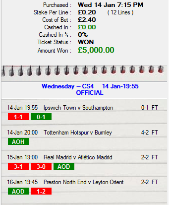 This punter made great use of ‘Any Other’ and scooped a monster £5,000 from a total bet of just £2.40 by playing 20p lines on the Pick4. Impressive.