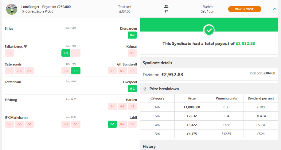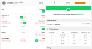 The ticket wasn’t quite over and, having made eight selections in the final leg, Consolation Prizes were still on the table. A 1-0 victory for Lahti at IFK Mariehamn ultimately ensured that the Syndicate had five out of six correct scores, a mightily impressive effort, and they were rewarded accordingly with a return of £2,932 as a result, 7.5x their initial stake.
