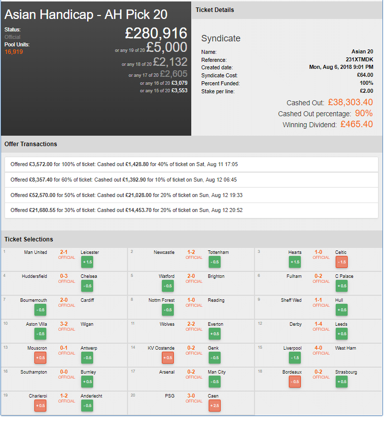 Another stunning win for an Asian Handicap Pick 20 Syndicate, this time Captained by BetBoss, came on a weekend in August 2018. It was a story that truly demonstrated the power of Cash Out.