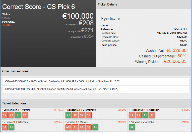 Putting faith in his original predictions proved to be a shrewd choice the following afternoon, as an 86th minute equaliser earned Arsenal a 1-1 draw and gave the Syndicate another offer on the back of a fifth winning leg. There was now €6,059 on the table for the remaining 70%.
