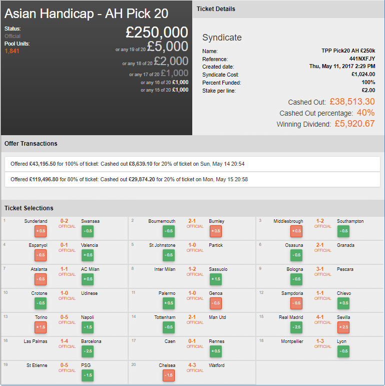In May 2017, TwoPoundPunt‘s Syndicate tackled an Asian Handicap Pick 20 pool featuring matches from England, Spain, Italy, France and Scotland. Despite the diverse array of legs, the Syndicate managed to blitz the pool, ultimately landing a £44,433 return from their £1,024 ticket. However, it was nearly so much more.