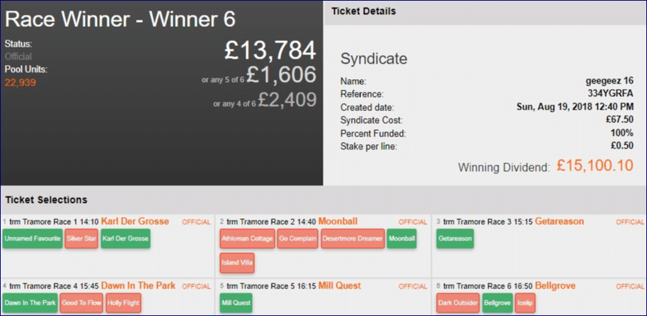 One of Matt’s Syndicates hit the bullseye, returning a mighty £15,100 from a ticket cost of £67.50!