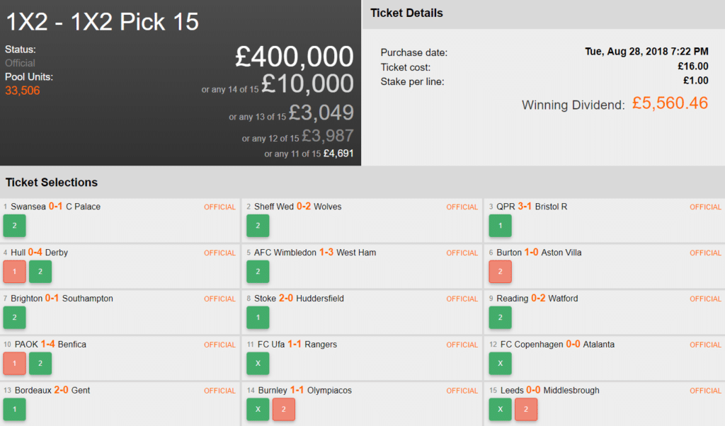 For those of you that thought the Pick 15 was a weekend only event, think again! Tuesday night saw one player build a £16 ticket only to miss the perfect 15 out of 15 by one leg. Aston Villa surprisingly failed to beat Burton, but worry not, this player walked away with £5,560 in Consolation prizes – Colossus reward you for those oh so close near misses 🙂