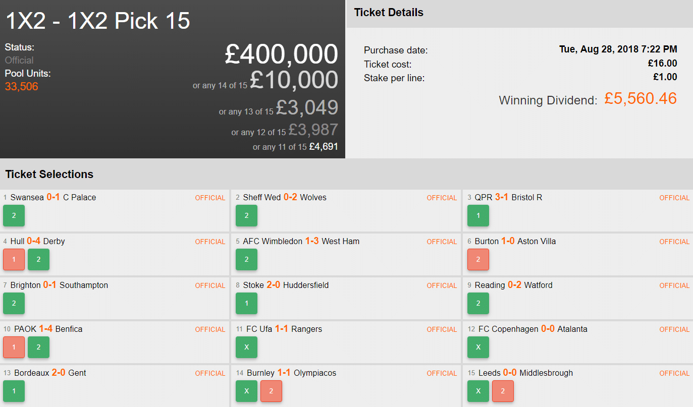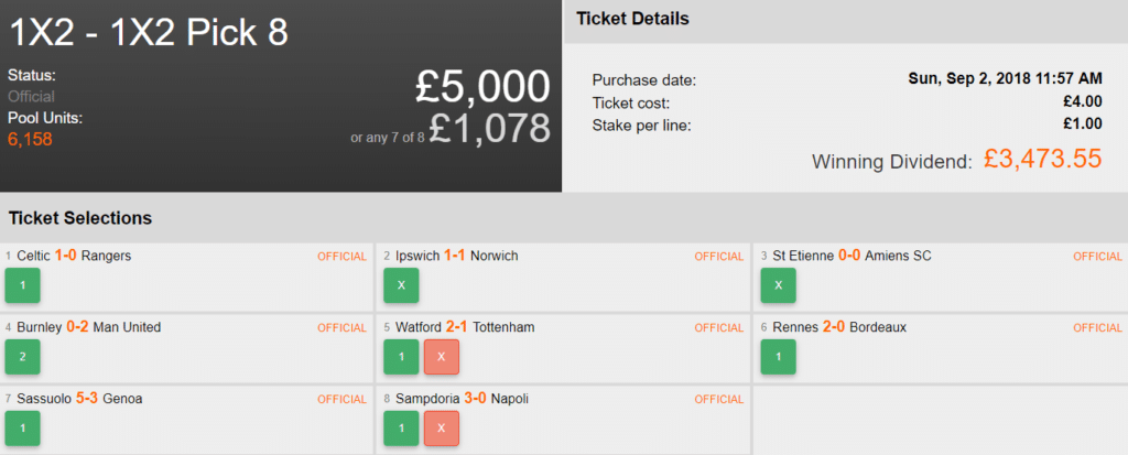 Now that all the European leagues are officially up and running, the return of a Euro flavoured Pick 8 has been well received and especially by this £4 punter. Watford maintained their 100% winning record in the Premier League with a surprise victory over Spurs, knocking out plenty of other Pick 8 players who’d banked on the North Londoner’s to get the win. Their loss was this punters gain – the final payout for their £4 ticket came to a handsome £3,473.