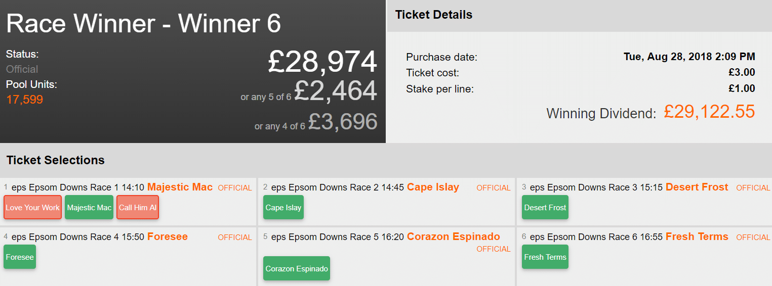 Tuesday afternoon proved an extra special Epsom meet for this Pick 6 punter. Using £1 stakes, they placed a 3 line ticket made up of three selections in race 1 and single banker selections in the remaining 5 legs. Majestic Mac did the business in the first and it was smooth from there on in as the remaining 5 selections all steamed home, earning this player an eye watering £29,122!