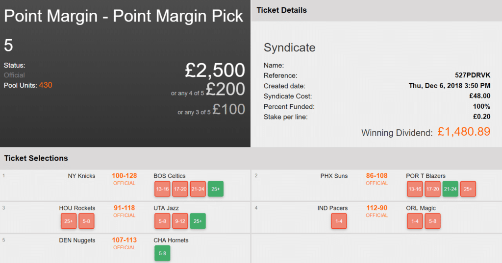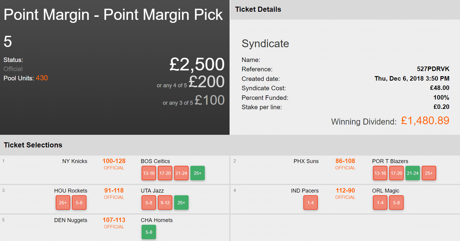 8 other players joined the Syndicate and they got off to a flying start with dominant victories for both the Celtics and Trail Blazers. The Captain had picked the same four Point Margins in both of these games, with the Celtics winning by 28 points and the Trail Blazers by 22.