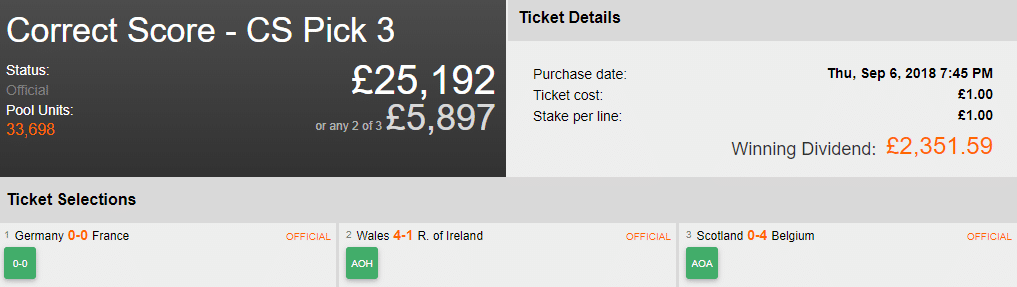 Here is a ticket that captures Colossus in a nutshell. The small stakes wager (£1 ticket cost) goes on to win £2,351 and our ‘Other Scores’ feature, features heavily! With Wales beating R. of Ireland 4-1 (Other Home Win) and Scotland losing to Belgium 0-4 (Other Away Win), this player had nailed legs 2 and 3 thanks to ‘Other Scores’!