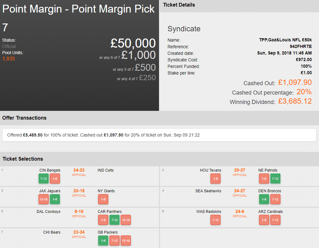 It’s an exciting time for all you American Football enthusiasts as the new season got underway, and for the 86 people who jumped aboard TwoPoundPunt’s first NFL Point Margin Pick 7 Syndicate of the season, there was even more excitement to be had. Opening up with a perfect 3/3 correct predictions this prompted a chunky Cash Out offer of £5,489 (Over 5 times the original stake).