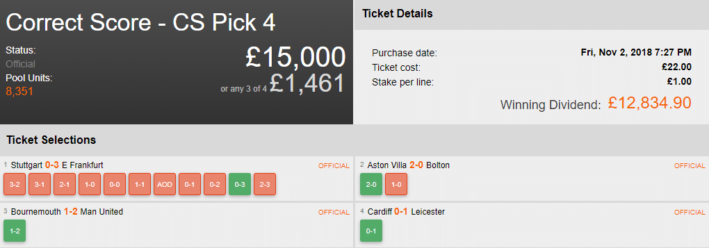 Everyone has their own approach to a Correct Score Pick 4 and it’s nice to see someone throw a curve ball once in a while! The Friday night coupon had a Bundesliga offering in leg 1 and this punter had gone big, covering a total of 11 scores. As luck would have it, a good one landed, Eintracht Frankfurt registering a 3-0 win. From here on in, there was less room for error.