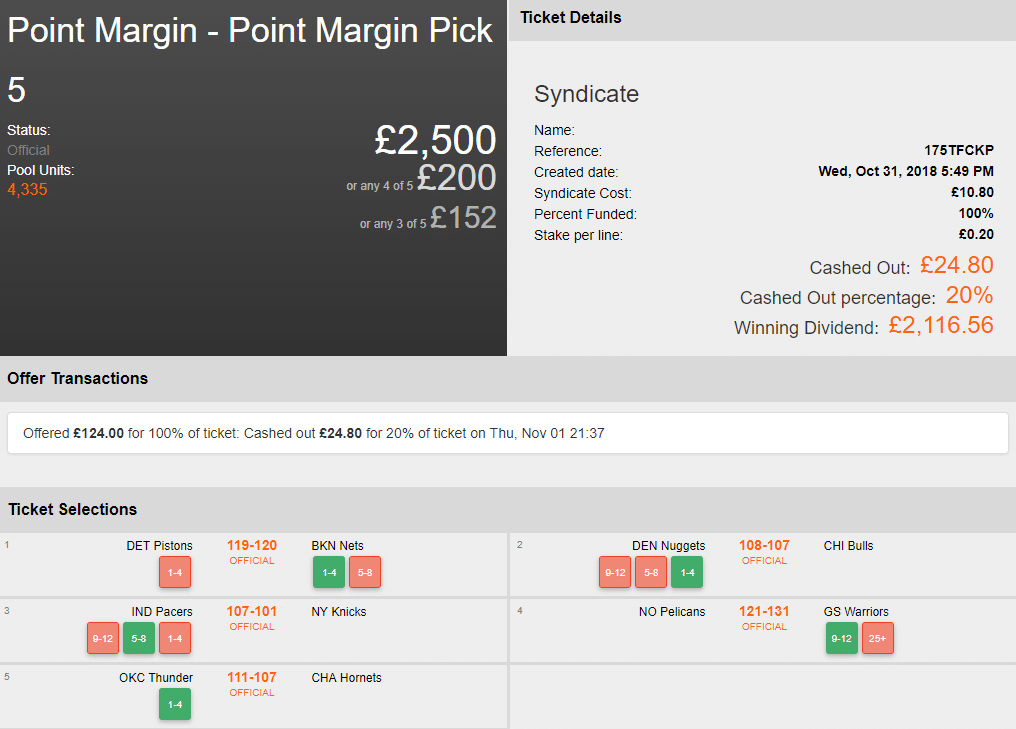 On to the final leg where they were relying on just one selection – the lowest Point Margin victory (1-4) for the Oklahoma City Thunder away at the Charlotte Hornets. Russell Westbrook flirted with a triple-double; scoring 29 points, 10 assists and 8 rebounds as the Thunder emerged as winners by a scoreline of 111-107, thus securing victory for the Syndicate.