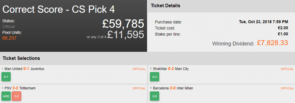 Moving in to the final two legs on Wednesday night, our punter’s two line ticket had Spurs to win 2-1 and also ‘Other Draw’. With the score sitting at 2-1 to Spurs, would the North London team hold on for a much needed three points? They would not. A late equaliser landing for PSV – superb news for this punter and that was topped off when Barca nailed Inter Milan with a 2-0 win. The winning dividend for this £2 outlay resulting in a massive £7,828.