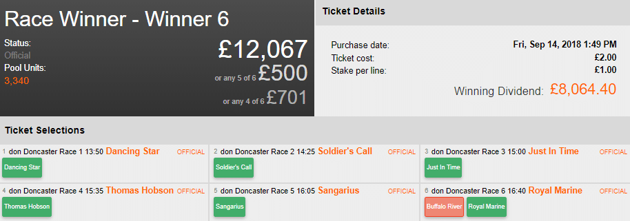 Steaming through the first five at Donny on Friday afternoon with a banker in each leg landing, this £2 punter had backed two in the 16:40 and it was Royal Marine who saw off the favourite – Buffalo River – as the ticket went on to return a humongous £8,064!