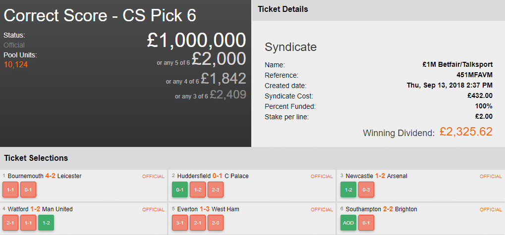 Nevertheless, 4 Correct Scores managed to bag the Syndicate a return of £2,325 from a £432 ticket, netting contributors over 5 times their stake. Keep an eye out on twitter for their Syndicate this weekend and join them in shooting for a share of £1,000,000 in the Pick 6!