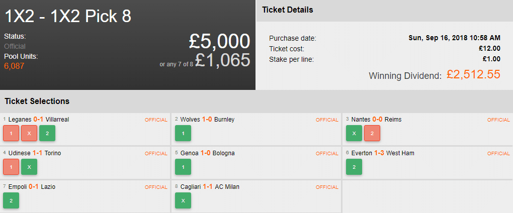 Unable to make a call on leg 1 in our Sunday Pick 8, this solo customer went for full cover as Villarreal travelled to Leganes. From then on it was smooth sailing. Two draws in legs 2 and 4 helped to knock out a large amount of tickets, but not as many as when West Ham won at Everton – a brave call from the punter. Cagliari’s draw with AC Milan wrapped things up and the customer will have been delighted to win £2,500 profit on their £12 ticket.