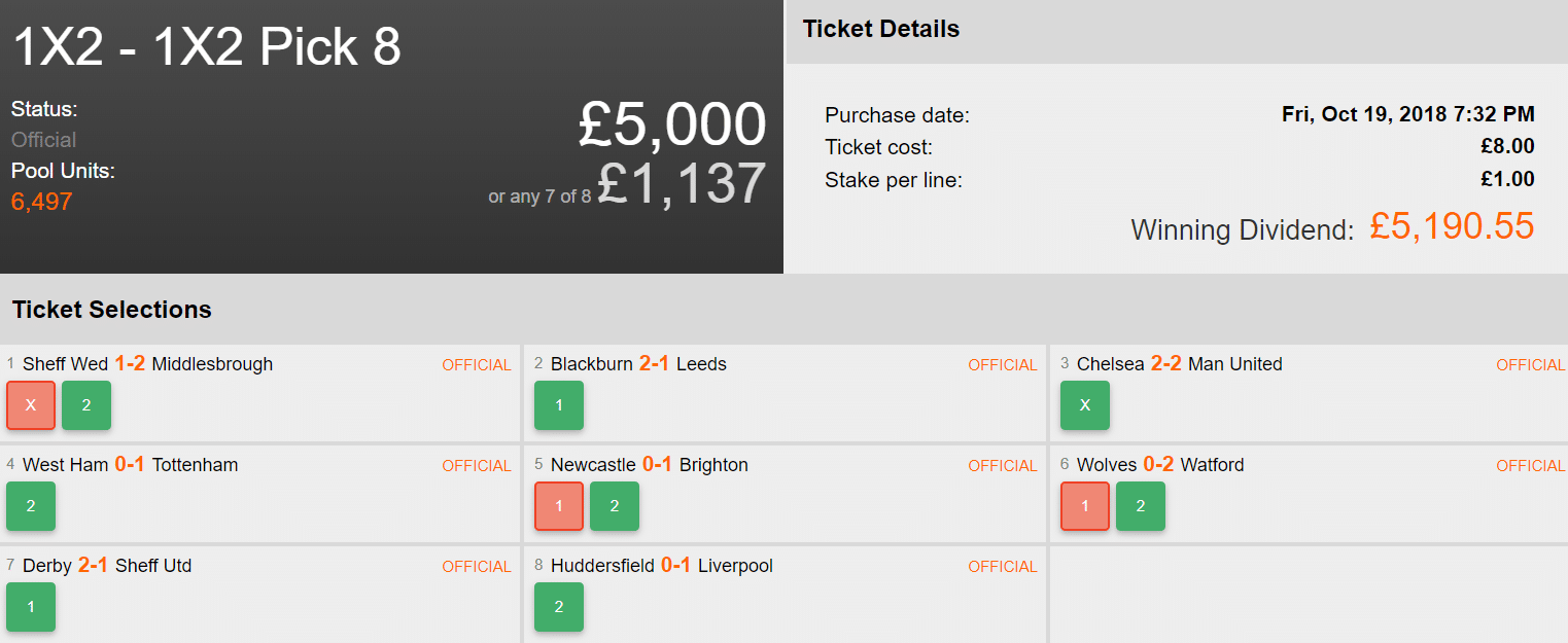 Legs 7 and 8 were played concurrently, as Derby got themselves a home win against Sheffield United and Liverpool held on to victory away at Huddersfield. Those two results led to a huge £5,190 from just an £8 bet! Great punt!