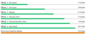 With the business end of the ticket looming, only 22 units remained in the pool and the player was counting on the 11/4 second favourite, Hot Touch, to see them through to the deciding leg. Fortune was definitely smiling on them as, once again, their selection overcame being held up in the early stages before running on to nab a narrow victory, this time by three-quarters of a length.