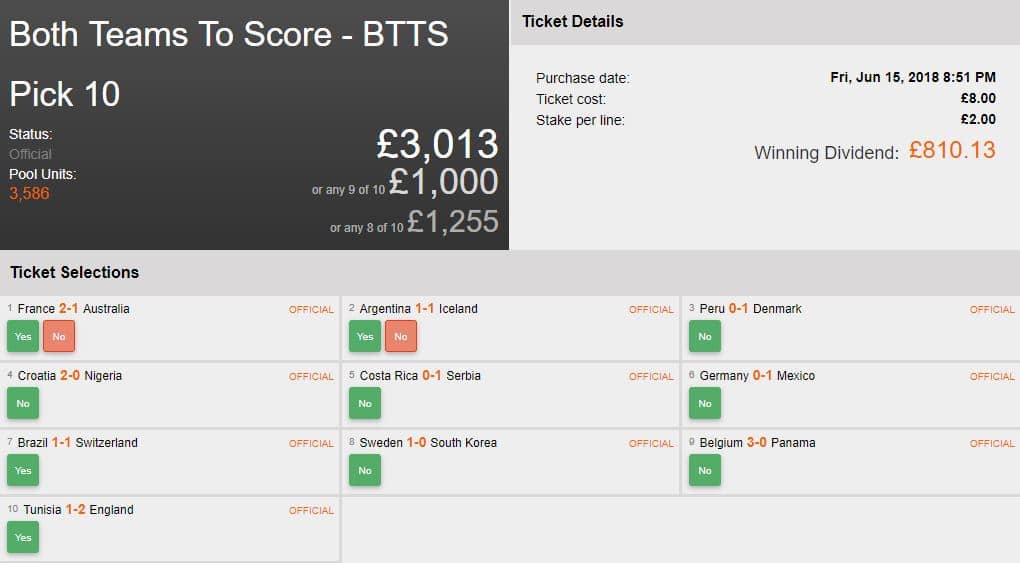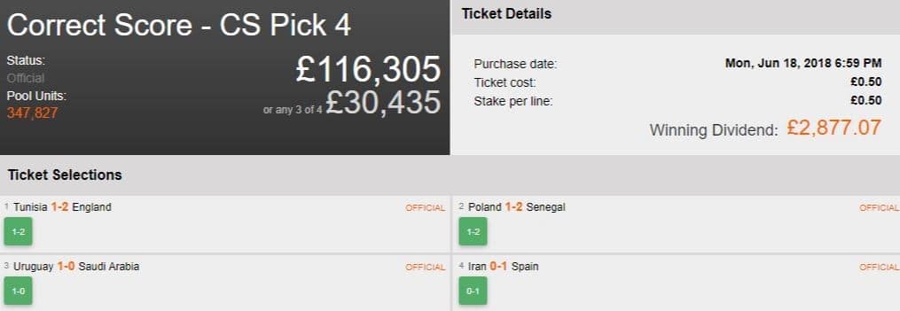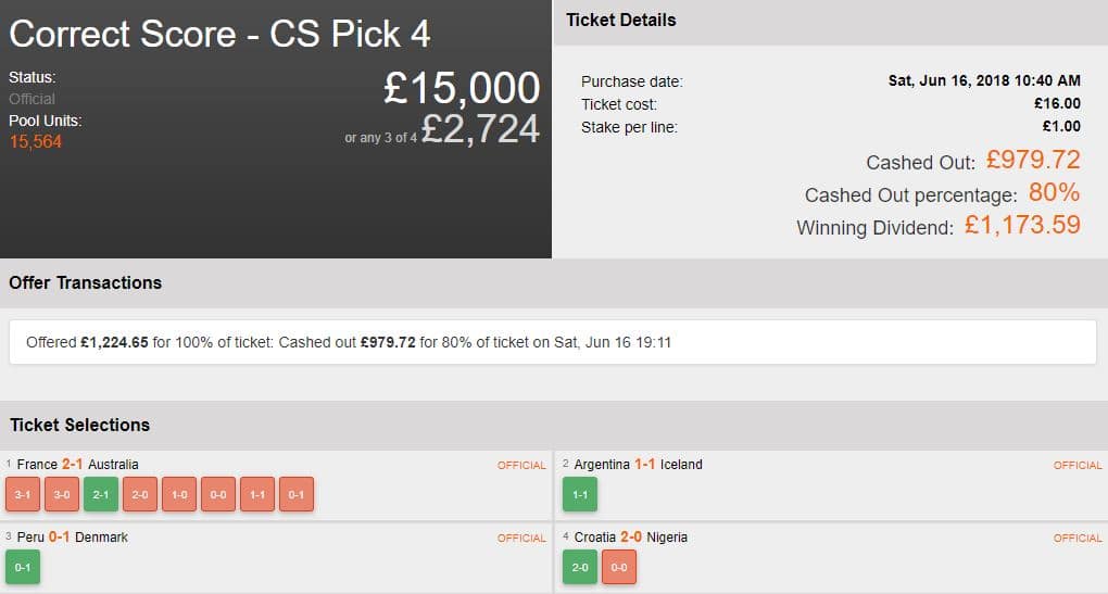 With Group C’s first match of France vs Australia proving to be a tough decision for this punter, 16 lines were all that was needed to secure a nice profit in the Correct Score Pick 4. Whilst the ticket holder decided to lock up £979 for 80% before the last leg, they went on to win a further £1,173 when Croatia put 2 goals past Nigeria in their first match. A fantastic result!