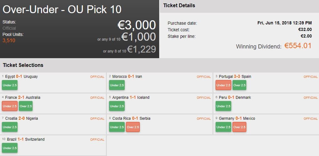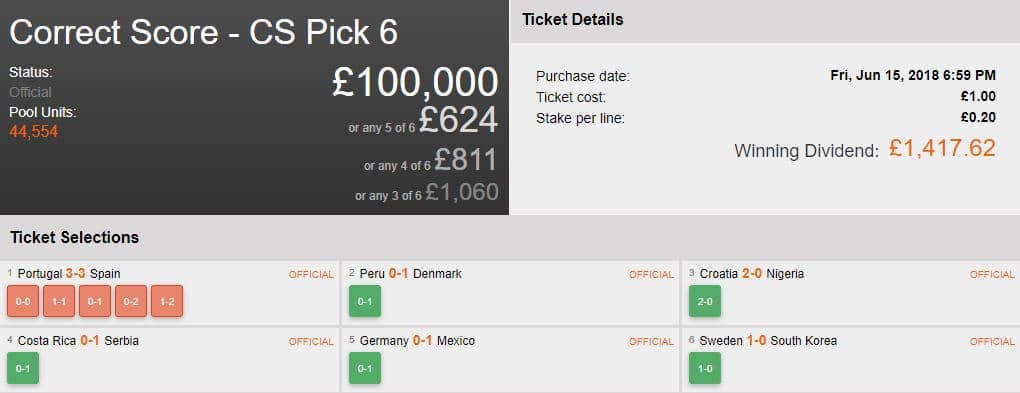 People often say, “It’s not about winning, it’s the taking part that counts”. Well, this ticket didn’t win, but still scooped a massive consolation prize of £1,417! The highly unpredictable 3-3 draw between Portugal and Spain may have shocked football fans but didn’t stop this ticket from bringing home the goods.
