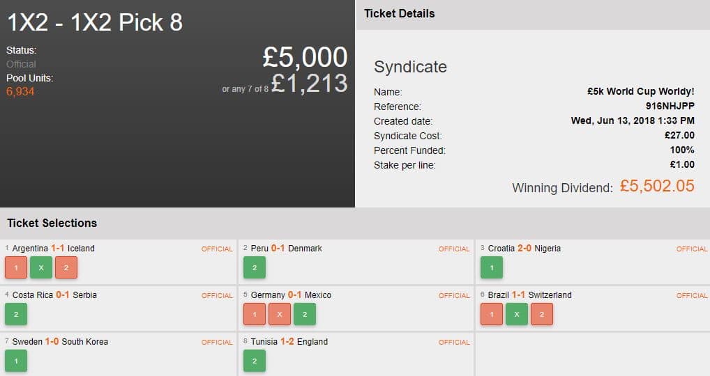 A bit of early World Cup luck for The Wise Old Sage’s Syndicate, making the correct predictions across 8 games to win a spectacular £5,502 for their Syndicate. With some upsets, such as Germany vs Mexico and Brazil vs Switzerland, The Wise Old Sage continued to deliver for all 8 matches with a helping hand from Harry Kane’s injury-time winner against Tunisia.