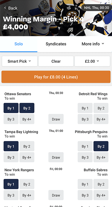 In Winning Margin pools, you must pick which team will win and by what goal difference in regular time for each game in the pool. Higher winning margins are grouped together in a single selection.