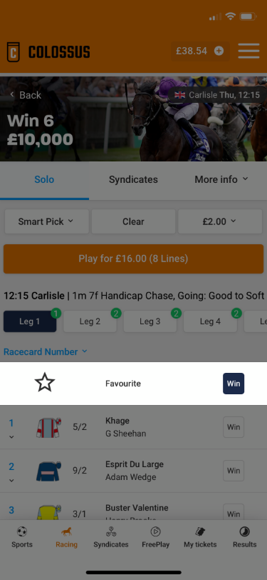 The “favourite” is the horse or greyhound that has the shortest SP (Starting Price i.e. final odds returned from the racecourse for each horse / greyhound to win) at the start of the race and is available as a selection in Win and Place pools.